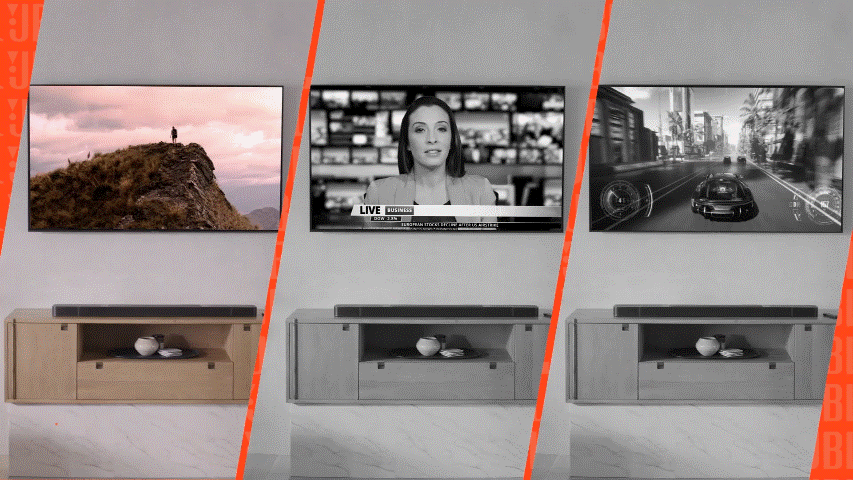 さらに、サウンドバーでありながらDolby AtmosとDTS:Xを完全な立体音響として再現できるようにするのがJBL独自の「MultiBeam」テクノロジーです。通常のサウンドバーではバーチャルで再現する上・横・背後のサウンドイメージを、ワイヤレスリアスピーカーとMultiBeam技術による「リアルサラウンド」と組み合わせることで、前後左右の二次元的な平面空間に高低までも描き出された三次元的な立体空間に包まれる「イマーシブオーディオ」を部屋中で体感いただけます。