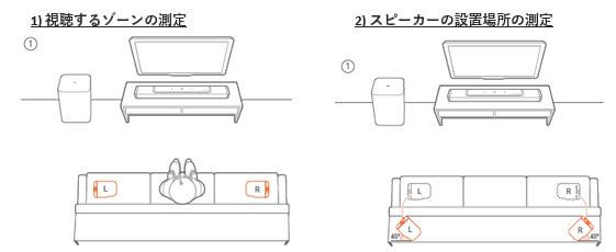 本体に内蔵された測定用マイクとスピーカーを使って、本体と壁との距離や壁材の違いによる反射速度の違い・空間の広さを測り、設置場所や空間に依存せず常に最適なサラウンドサウンド効果が得られるよう測定し自動で補正するのが「キャリブレーション(部屋の測定)」機能です。