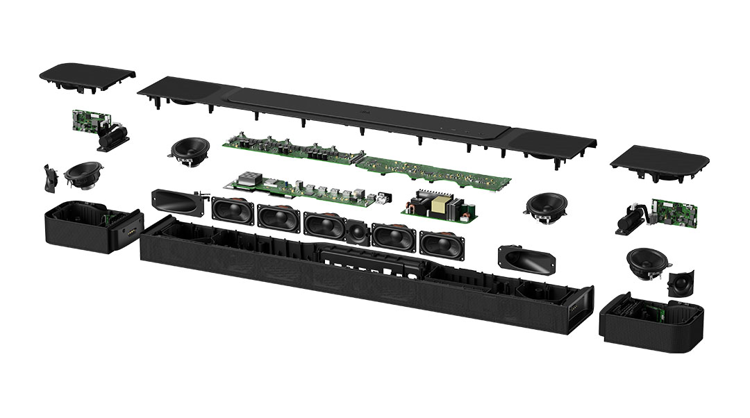 サウンドバーの限られた筐体スペースの中に10基ものスピーカーを配備し、それでいながら最高のサウンドパフォーマンスを実現するためには高度なスピーカー設計と緻密な筐体設計が必要です。スピーカーを知り尽くしたJBLのエンジニアだから成し得た奇跡のようなスピーカーシステムなのです。