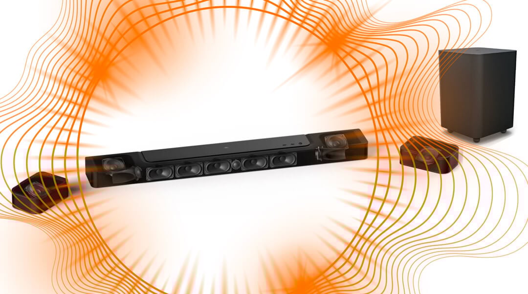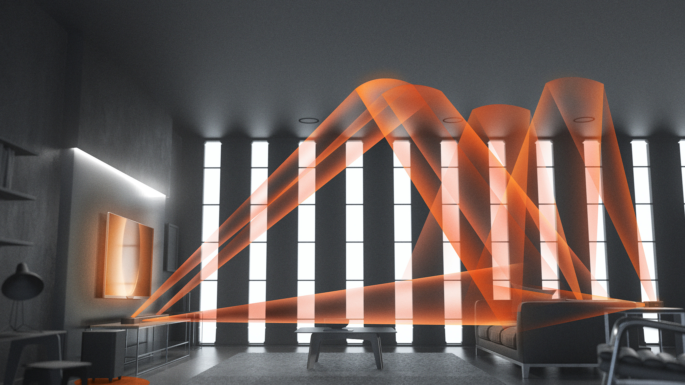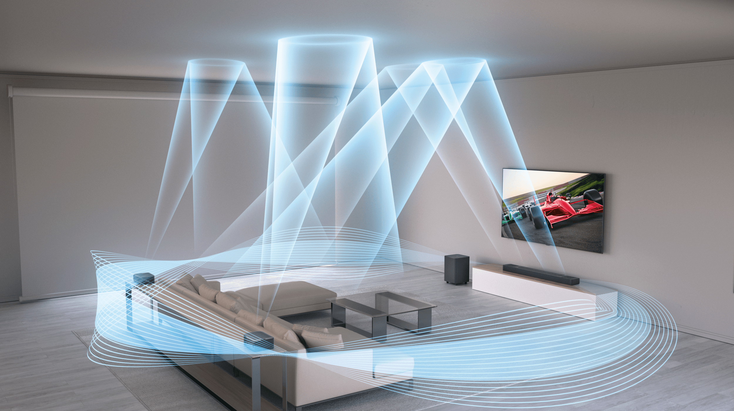 音のビームを放射する「ビームフォーミングスピーカー」が部屋の壁を反射してリスニングポジションに側面から音を届けます。前方のサウンドバーと後方のワイヤレススピーカーの間を音のビームが満たし、全方位抜け目のないサラウンド空間を形成します。
